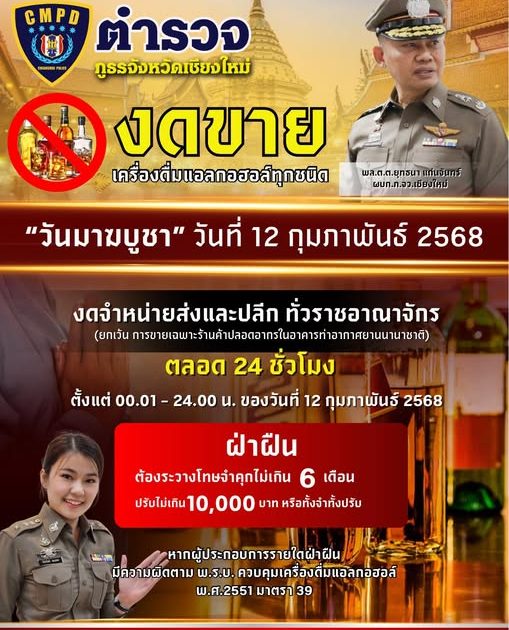 ตำรวจภูธรจังหวัดเชียงใหม่ (CMPD) เตือนงดขายเครื่องดื่มแอลกอฮอล์ในวันมาฆบูชา หากพบฝ่าฝืนดำเนินการตามกฎหมายทันที