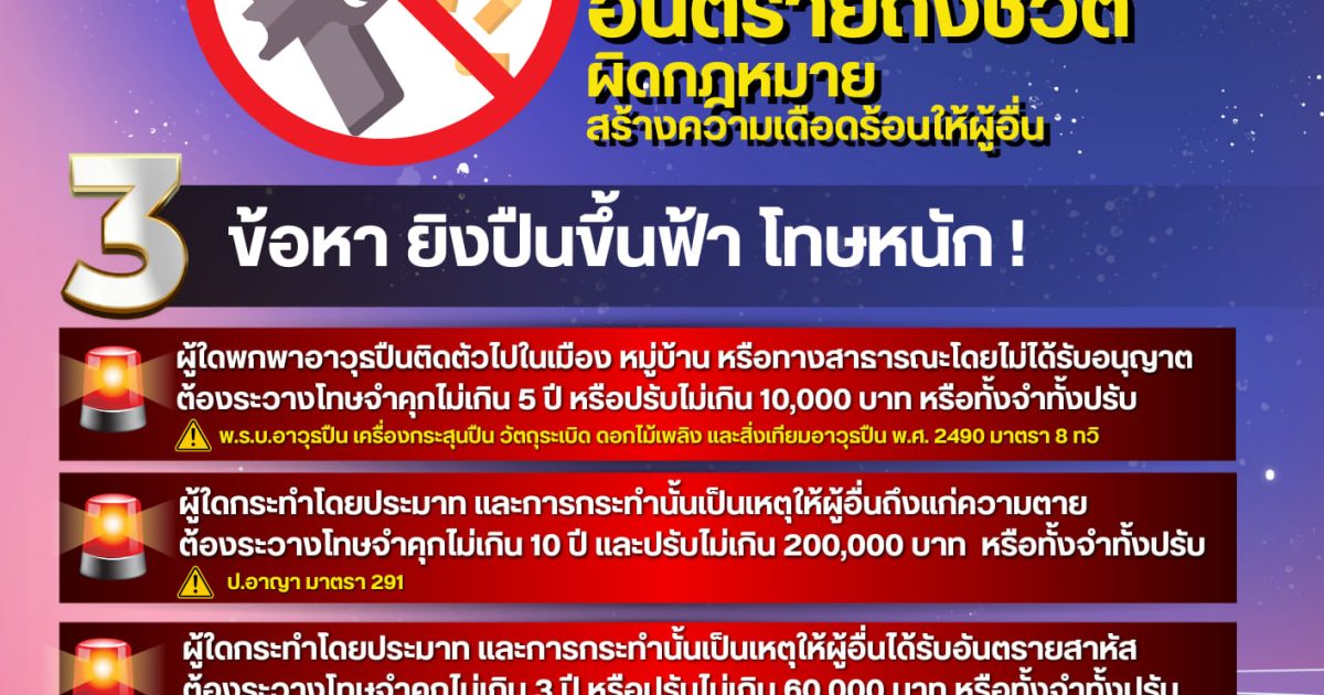 “การยิงปืนขึ้นฟ้า” เป็นค่านิยมที่ผิด และก่อให้เกิดอันตรายทั้งต่อตนเอง และผู้อื่น โดยอาจถึงขั้นเสียชีวิตได้ . “การยิงปืนขึ้นฟ้า มีความผิดตาม พ.ร.บ.อาวุธปืน เครื่องกระสุนปืน วัตถุระเบิด ดอกไม้เพลิง และสิ่งเทียมอาวุธปืน พ.ศ. 2490 มาตรา 8 ทวิ ห้ามมิให้ผู้ใดพาอาวุธปืนติดตัวไปในเมือง หมู่บ้าน หรือทางสาธารณะโดยไม่ได้รับใบอนุญาต ผู้ใดฝ่าฝืนจะมีความผิดตามกฎหมาย ต้องระวางโทษจำคุกไม่เกิน 5 ปี หรือปรับไม่เกิน 10,000 บาท หรือทั้งจำทั้งปรับ . และหากกระสุนตกใส่ หรือทะลุหลังคาบ้านเรือน ทำให้ทรัพย์สินเสียหาย หรือมีผู้ได้รับบาดเจ็บ หรือเสียชีวิต ก็จะมีความผิด ตามประมวลกฎหมายอาญา มาตรา 291 ผู้ใดกระทำโดยประมาท และการกระทำนั้นเป็นเหตุให้ผู้อื่นถึงแก่ความตาย ต้องระวางโทษจำคุกไม่เกิน 10 ปี และปรับไม่เกิน 200,000 บาท มาตรา 300 ผู้ใดกระทำโดยประมาท และการกระทำนั้นเป็นเหตุให้ผู้อื่นรับอันตรายสาหัส ต้องระวางโทษจำคุกไม่เกิน 3 ปี หรือปรับไม่เกิน 60,000 บาท หรือทั้งจำทั้งปรับ”