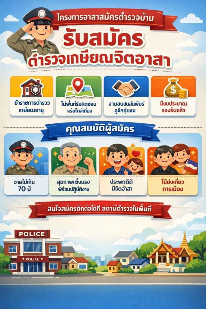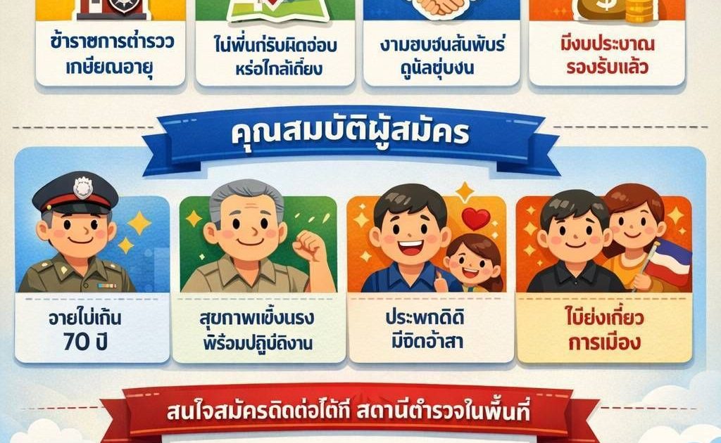 ประกาศรับสมัครข้าราชการตำรวจเกษียณอายุราชการ ตำรวจเกษียณจิตอาสาเนื่องจากเป็นผู้มีความรู้ความชำนาญและมีประสบการณ์ในการปฏิบัติงานมาอย่างยาวนานให้เข้ามามีส่วนร่วมในการช่วยเหลือราชการและดูแลชุมชนในงานด้านชุมชนสัมพันธ์และงานอื่นในสถานีโดยรับสมัครเป็นข้าราชการตำรวจเกษียณอายุราชการที่มีภูมิลำเนาอยู่ในเขตพื้นที่รับผิดชอบหรือพื้นที่ใกล้เคียงเพื่อเข้าร่วมโครงการและให้เข้าไปเป็นส่วนหนึ่งโครงการอาสาสมัครตำรวจบ้านที่ได้จัดสรรงบประมาณลงไปแล้วโดยคุณสมบัติผู้สมัครเบื้องต้นมีดังนี้ 1 เป็นข้าราชการตำรวจที่เกษียณอายุราชการแล้วอายุไม่เกิน 70 ปี 2 มีสุขภาพร่างกายแข็งแรงไม่เป็นอุปสรรคต่อการปฏิบัติหน้าที่ 3 มีความประพฤติดีเป็นที่ยอมรับของชุมชนและมีจิตอาสา 4 ไม่เป็นผู้ดำรงตำแหน่งทางการเมืองหรือเจ้าหน้าที่พรรคการเมือง