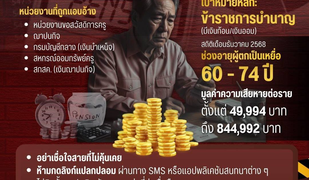 โฆษกสำนักงานตำรวจแห่งชาติ กล่าวด้วยว่า จากข้อมูลล่าสุดในเดือนธันวาคม 2568 เพียงเดือนเดียว มีกลุ่มผู้สูงวัยอายุระหว่าง 60-74 ปี เข้าแจ้งความถูกหลอกโอนเงิน มียอดความเสียหายตั้งแต่หลักหมื่นไปจนถึงเกือบ 1 ล้านบาทต่อราย สิ่งนี้ชี้ให้เห็นว่ากลุ่มข้าราชการบำนาญเป็นเป้าหมายหลักที่คนร้ายให้ความสนใจ เนื่องจากเป็นกลุ่มที่มีเงินออมและอาจไม่เท่าทันเทคโนโลยีสมัยใหม่
