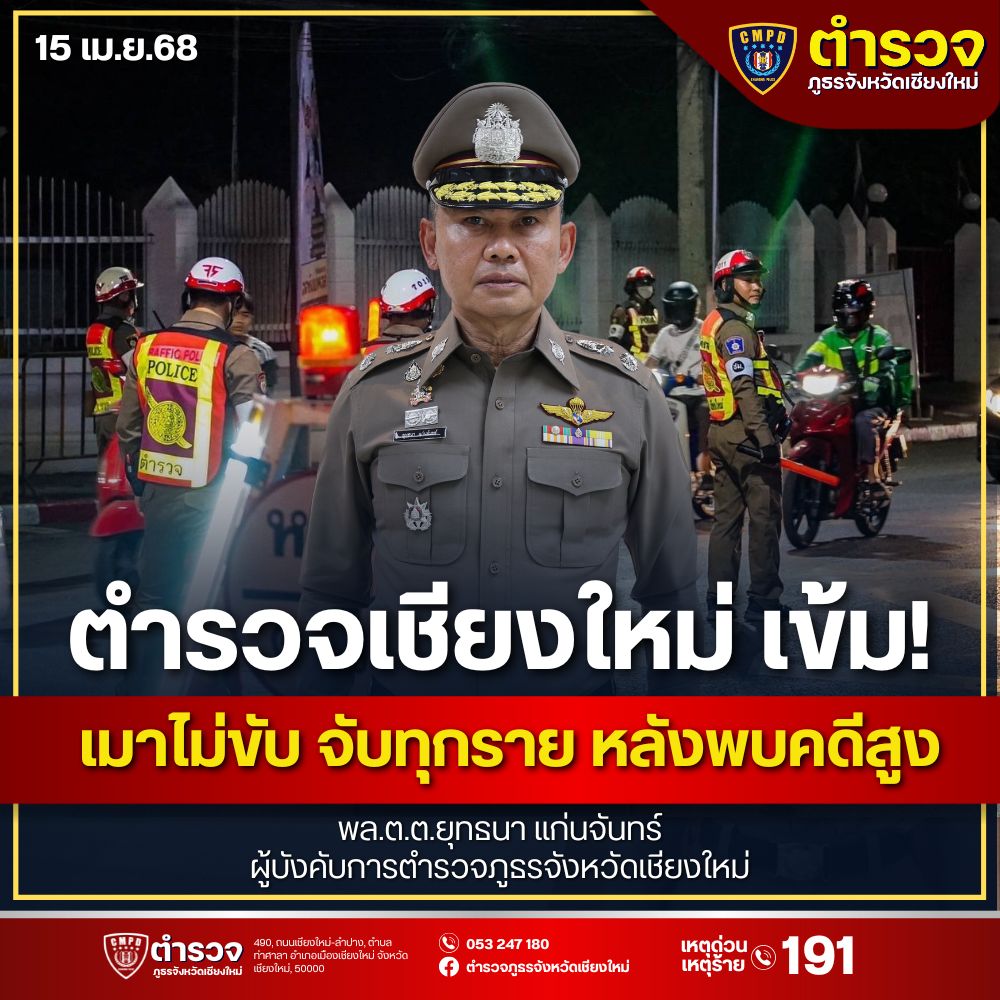ตร.เชียงใหม่ลุยเข้ม “เมาไม่ขับ” สงกรานต์! ตำรวจตั้งด่านตรวจทุกเส้นทาง สั่งจับจริงไม่มีข้อยกเว้นเชียง