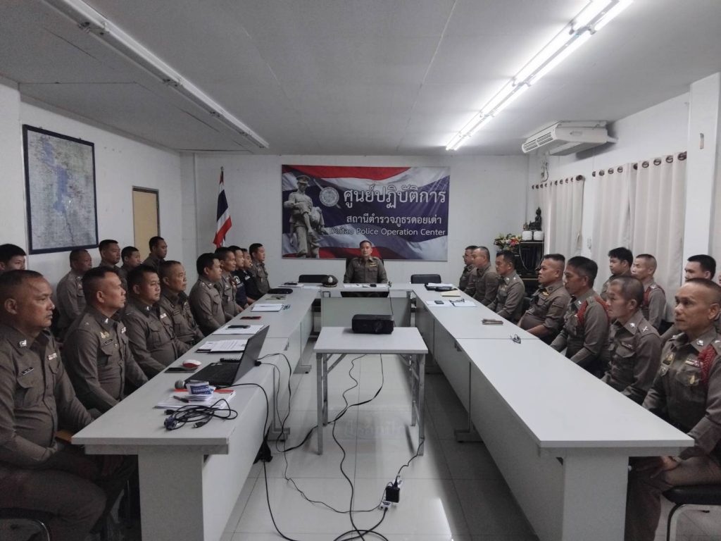 หัวหน้าสถานีตำรวจชี้แจงและให้ข้อมูลเกี่ยวกับการประเมินแก่เจ้าหน้าที่ตำรวจในหน่วยงาน